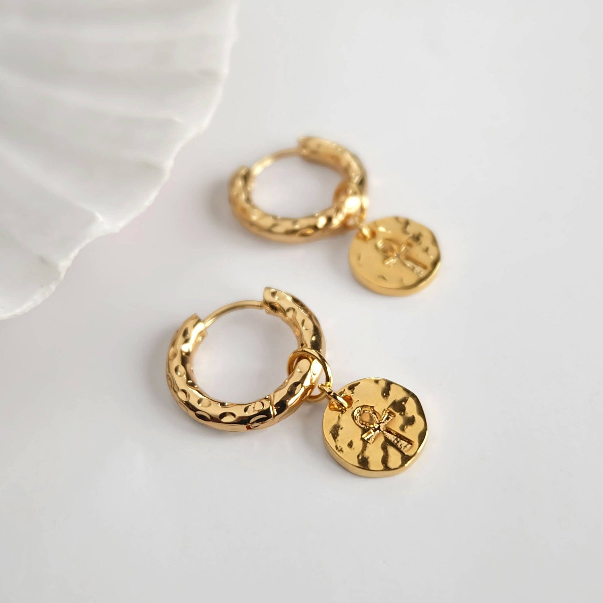 These Egyptian-inspired earrings feature an ankh coin charm — a symbol of life and believed to bring good fortune. The hammered texture adds a unique glistening finish, paired with easy-to-fasten hinged hoops. A beautifully elegant choice for anyone drawn to the magic of Ancient Egypt. Materials Hoops are gold plated stainless steel and charms are gold plated brass.
